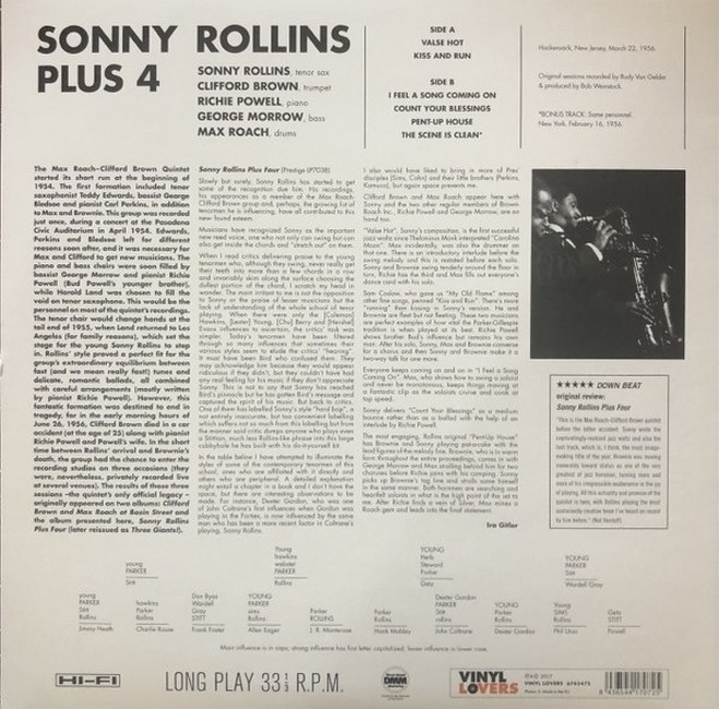 Фірмова вінілова платівка (VINYL)Sonny Rollins Plus 4 is a jazz album by Sonny Rollins, released in 1956 on Prestige Records. On this album Rollins plays with the Clifford Brown/Max Roach Quintet. The album was the last recording including pianist Richie Powell and Brown, as both died in a car accident three months later.