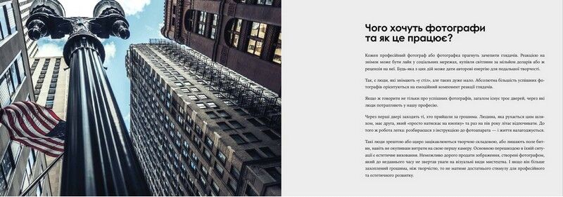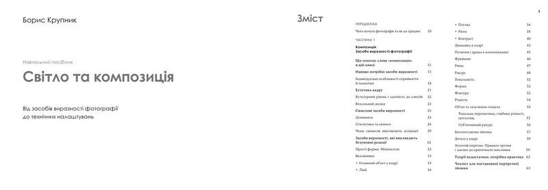 Цей посібник формує системне уявлення про фотографію для читачів, які прагнуть активно в ній розвиватися. На роботах іменитих фотографів та прикладах із попкультури розглянуто, як працюють прийоми візуального мистецтва. Перша частина книжки присвячена композиції та засобам виразності у фотографії. Друга частина детально розкаже про роботу з освітленням, зокрема зі студійними джерелами світла. Автор посібника — фотограф-практик і викладач фотошколи, тож інформацію подано легко та зрозуміло, а всі поради базуються на реальному досвіді. Книжка буде корисною як новачкам, так і професіоналам.