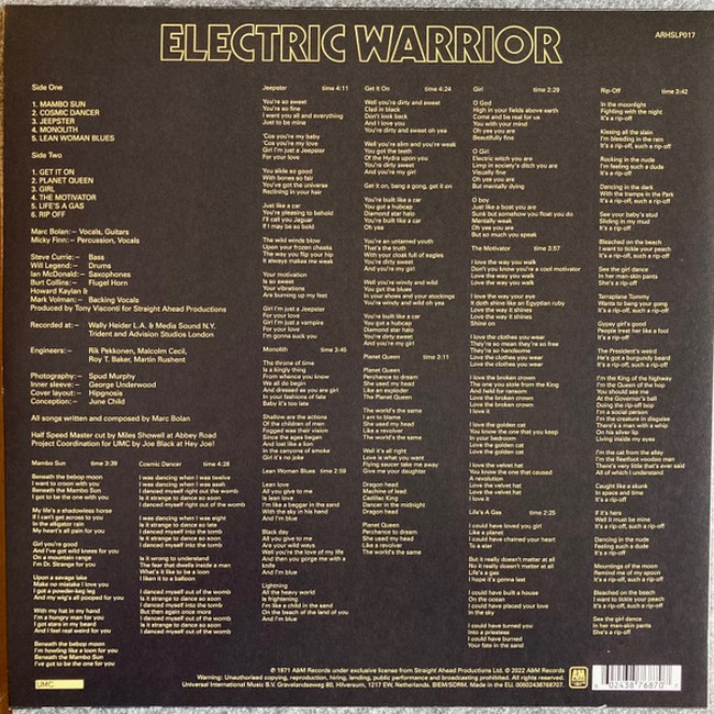 Фірмова вінілова платівка (VINYL)Electric Warrior is the second studio album by English rock band T. Rex, their sixth since their debut as Tyrannosaurus Rex. The album marked a turning point in the band's sound, moving away from the folk-oriented sound of the group's previous albums and pioneering a more flamboyant, pop-friendly glam rock style.