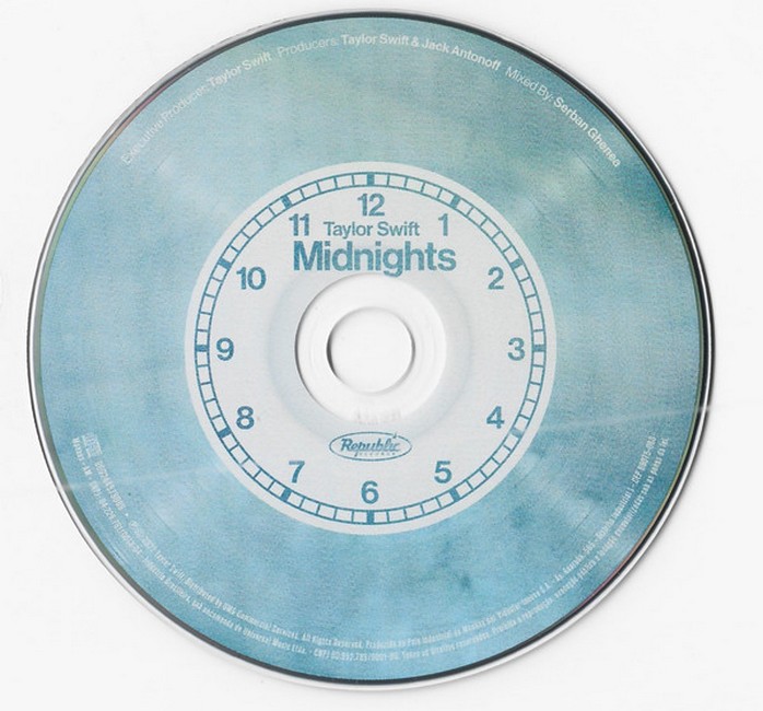 Фірмовий CD-дискMidnights is the tenth studio album by American singer-songwriter Taylor Swift, released on October 21, 2022, via Republic Records. Announced at the 2022 MTV Video Music Awards, Midnights marked Swift's first new body of work since her 2020 indie folk albums, Folklore and Evermore. It is a moody concept album about nocturnal ruminations, written and produced by Swift with longtime collaborator Jack Antonoff.