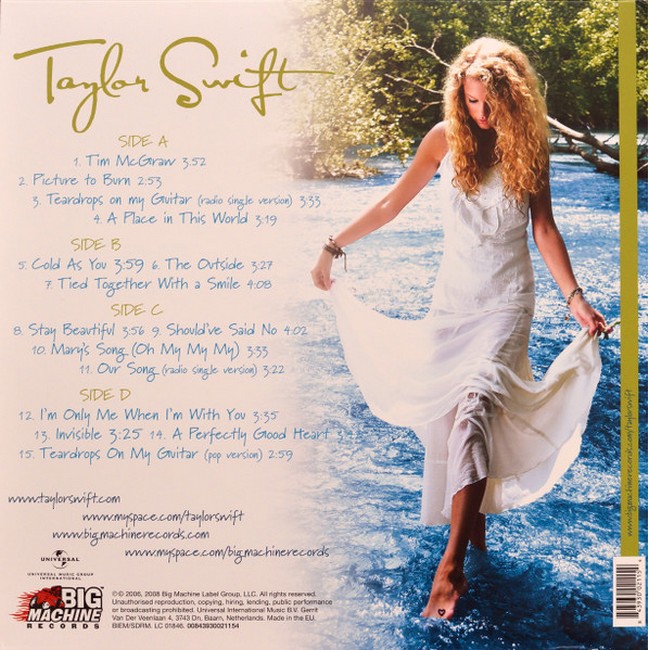 Навеяно ностальгией по беззаботным дням и мягким звучанием гитары, этот альбом – истинная жемчужина современной кантри-музыки. «Taylor Swift – Taylor Swift», первый студийный альбом певицы, выпущенный на двух пластинках, стал настоящим откровением в мире folk и country.
