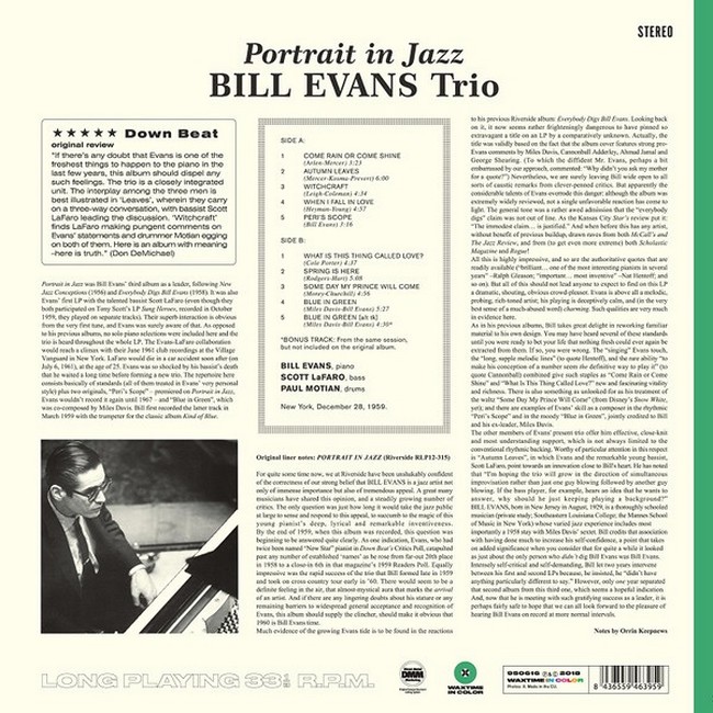 Фірмова вінілова платівка (VINYL)Portrait in Jazz is the fifth studio album by American jazz pianist Bill Evans as a leader, released in 1960. It is the first of only two studio albums to be recorded with his famous trio featuring bassist Scott LaFaro and drummer Paul Motian.