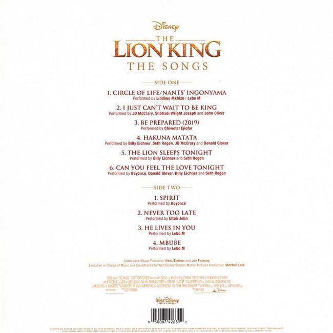 Фірмова вінілова платівка (VINYL)The Lion King: Original Motion Picture Soundtrack is the soundtrack for the 2019 photorealistic CGI remake of Disney's 1994 animated feature film of the same name. It features songs from the original film written by Elton John and Tim Rice and performed by the film's cast.