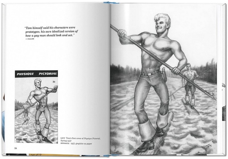 When he began to draw he celebrated these early idols, improving their wardrobes with tight jeans, faded T-shirts, and thigh-high beak-toed Lappish boots. It was a young logger in this gear who appeared on the spring 1957 cover of Physique Pictorial, introducing Tom to the world. In the decades to follow Tom added truckers, repairmen, construction workers, circus roustabouts, and the American cowboy to his roster of working-class heroes. Though just sexual fantasies for him, his portrayal of blue-collar lovers helped working class gays accept their true selves.