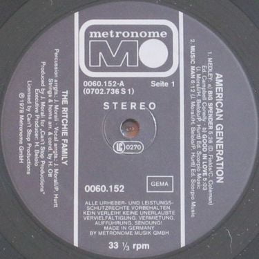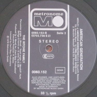 American Generation by the American disco group The Ritchie Family was released in 1978. This album captures the vibrant energy of the late disco era, with the title track "American Generation" becoming a popular anthem of the time. The album showcases the group’s signature blend of upbeat rhythms, harmonized vocals, and infectious grooves, celebrating themes of youth and freedom. American Generation solidified The Ritchie Family's place in the disco world, as they moved beyond the conceptual themes of their earlier albums to embrace a more mainstream disco sound. Though not as conceptually extravagant as Arabian Nights, it still resonated with fans and dancers, reflecting the upbeat spirit of the late '70s disco movement.