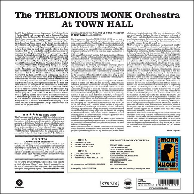 Фірмова вінілова платівка (VINYL)The Thelonious Monk Orchestra at Town Hall is an album by Thelonious Monk, released in 1959. The concert included Hall Overton’s arrangements on Monk’s tunes (including a transcription of Monk's piano solo on "Little Rootie Tootie").