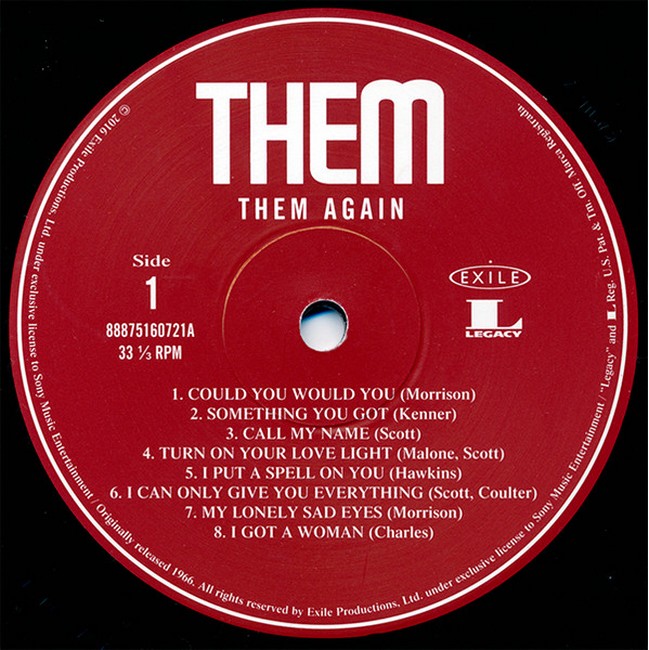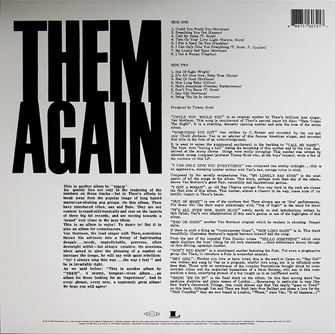 Фірмова вінілова платівка (VINYL)Them Again is the second album by the Northern Irish band Them, fronted by lead singer and songwriter Van Morrison. The album was released by Decca Records in the UK on 21 January 1966, but it failed to chart. In the U.S., the album was released with somewhat different tracks in April 1966 and it peaked at number 138 on the Billboard chart.