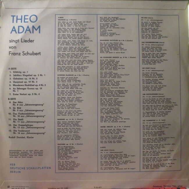 Theo Adam, Franz Schubert – Singt Lieder Von Franz Schubert