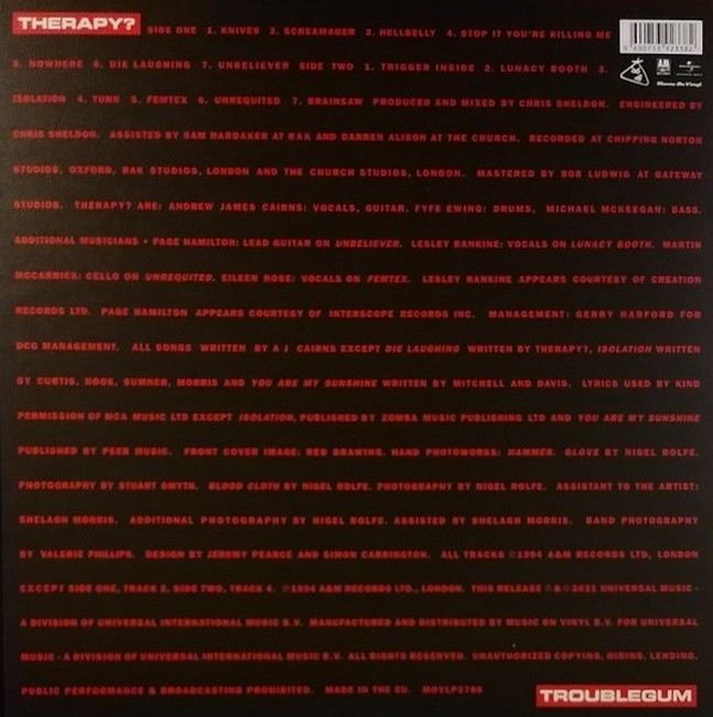 Фірмова вінілова платівка (VINYL)Troublegum is the second major label album by the Northern Irish rock band Therapy? It was released on 7 February 1994 via A&M Records. The album features a more punk-oriented style compared to the likes of Stiff Little Fingers and the Undertones rather the band's previous noise rock-influenced works.