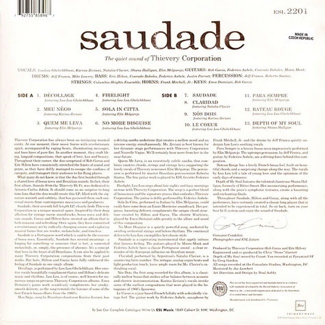 Фірмова вінілова платівка (VINYL)Saudade (Portuguese for "Longing") is the seventh studio album by Washington DC electronica duo Thievery Corporation released in 2014 via their Eighteenth Street Lounge Music label. Eric Hilton, the band's co-founder, called Saudade his favorite Thievery album, saying "it's one of the more unusual records by an electronic music artist. I don't think any other electronic music artist would make a record like that one."