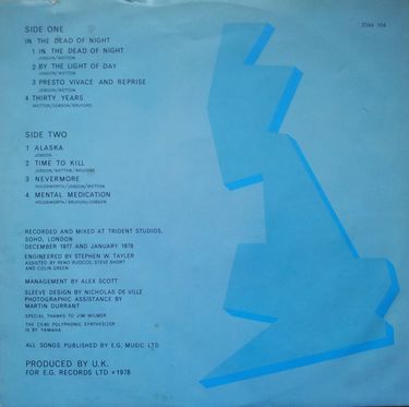 U.K. by the British band U.K. is a self-titled debut album released in 1978. The band, formed by progressive rock veterans John Wetton (King Crimson), Bill Bruford (Yes), Allan Holdsworth (Soft Machine), and Eddie Jobson (Roxy Music), combined elements of progressive rock, jazz fusion, and electronic music. The album features complex compositions and virtuoso musicianship, with standout tracks like "In the Dead of Night" and "Thirty Years," which showcase intricate instrumental passages and atmospheric soundscapes. U.K. received critical acclaim for its innovative sound, marking the band as a progressive rock supergroup. Despite lineup changes after this release, the album remains a landmark in the genre, noted for its technical prowess and artistic ambition.
