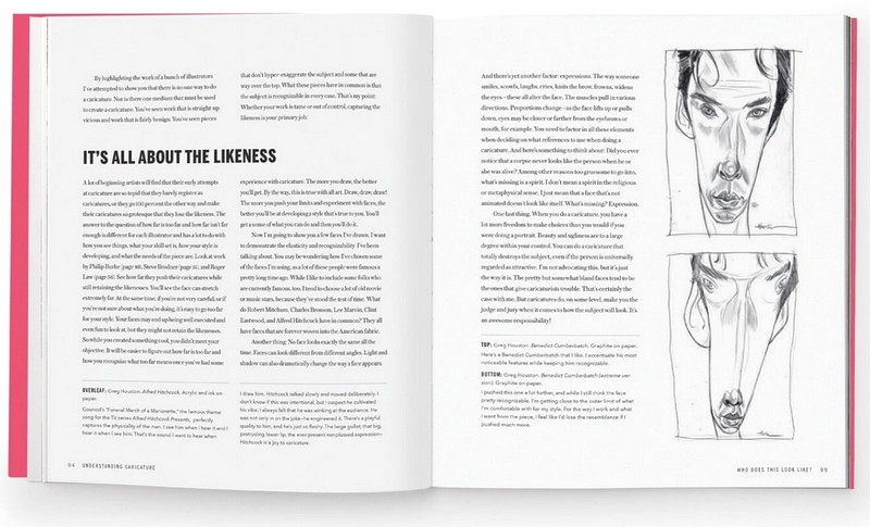 Дав определение карикатуре, отличив ее от других форм портретной живописи и углубившись в ее многовековую историю, Хьюстон приступает к мельчайшим вопросам того, как это сделать. Он последовательно фокусируется на лице, волосах, теле и том, что он называет «аксессуарами» — отличительными предметами одежды, которые помогают зрителям сразу идентифицировать знаменитостей.