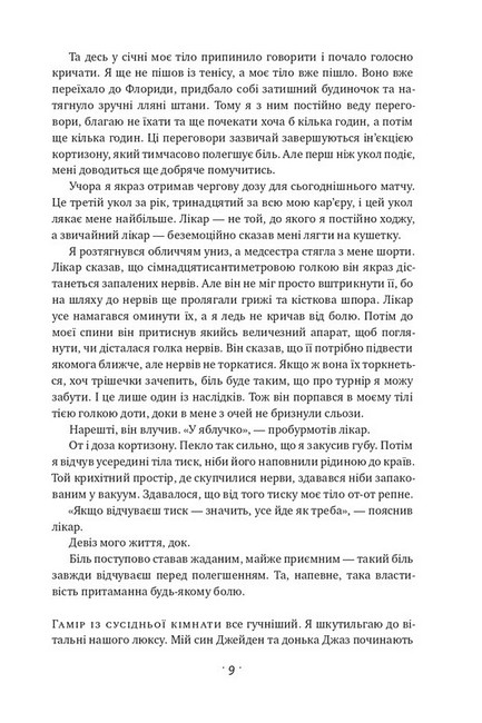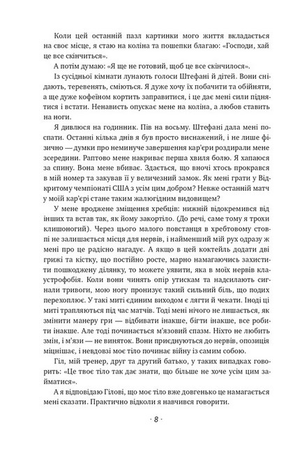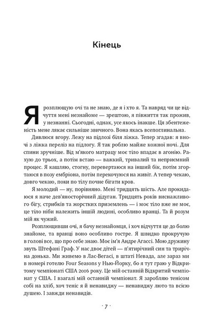Андре Агассі був і залишається однією з найяскравіших зірок великого тенісу. За свою кар’єру він виграв 60 турнірів, став першою ракеткою світу та олімпійським чемпіоном. Проте головним його ворогом був не суперник на корті, а він сам. Чемпіон світу, що ненавидів теніс. Ніхто не запитував його, чи хоче він бути спортсменом. Батько практично заштовхав його на корт, примушуючи змалечку відточувати удари. Він почувався нещасним і водночас турнір за турніром ішов до титулу абсолютного чемпіона.У своїй щирій біографії Агассі розказує про непрості стосунки з батьком, який одночасно лякав його та вишколив з нього переможця, про бунтарські вчинки в житті й на корті, про щоденну боротьбу із фізичним болем від постійних тренувань і про ставлення до гри, яка попри все стала сенсом його життя.