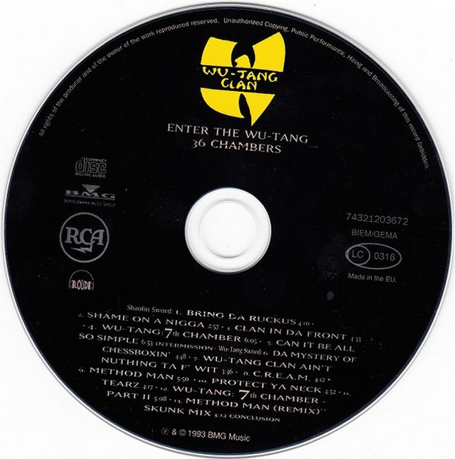 Фірмовий CD-дискEnter the Wu-Tang (36 Chambers) is the debut studio album by the American hip-hop group Wu-Tang Clan, released on November 9, 1993, by BMG, RCA Records and Loud Records. Recording sessions took place during late 1992 to early 1993 at Firehouse Studio in New York City, and the album was produced by the group's de facto leader RZA. Its title originates from the martial arts films Enter the Dragon (1973) and The 36th Chamber of Shaolin (1978).