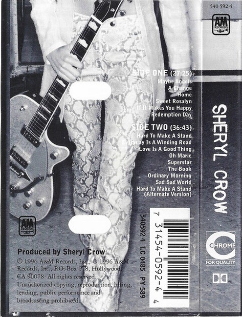 Ліцензійна касета (CASSETTE)Sheryl Crow is the second studio album by American singer and songwriter Sheryl Crow, released on September 24, 1996, by A&M Records. Unlike its predecessor Tuesday Night Music Club, which was written by a casual collective formed by Crow and several other musicians, Sheryl Crow was entirely produced by Crow, who wrote most of the songs alone or with only one or two collaborators. Most of the album was recorded at Kingsway Studios in New Orleans, Louisiana. The album covers topics of American life, relationship breakups, and moral and ethical issues, while encompassing a variety of music genres such as rock, blues, alternative rock, country, and folk.