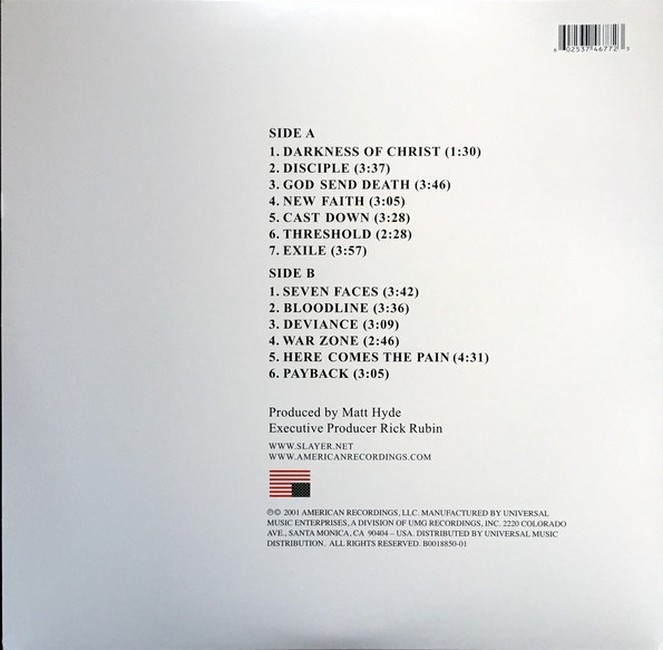 Фірмова вінілова платівка (VINYL)God Hates Us All is the ninth studio album by American thrash metal band Slayer, released on September 11, 2001, by American Recordings. It was recorded over three months at The Warehouse Studio in Vancouver, and includes the Grammy Award-nominated song "Disciple".