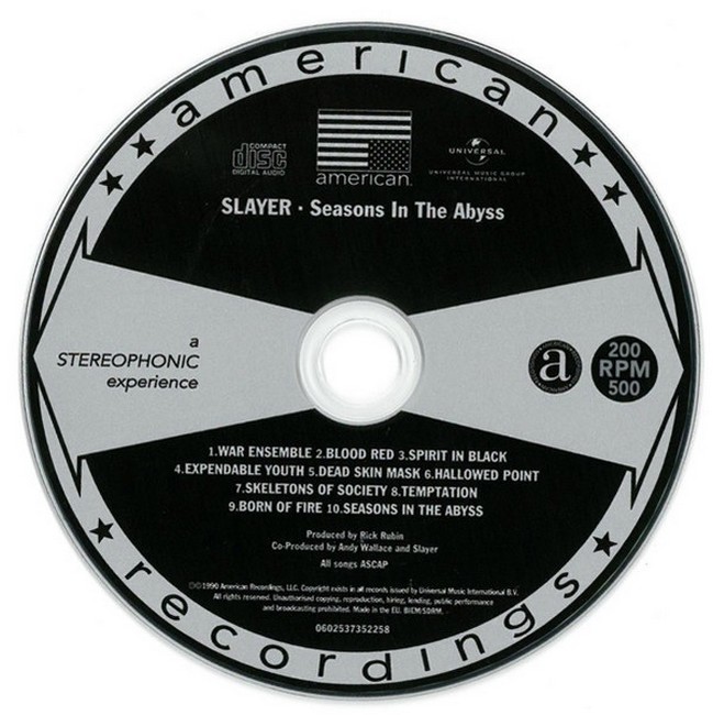 Фірмовий диск (CD)Seasons in the Abyss is the fifth studio album by American thrash metal band Slayer, released on October 9, 1990, through Def American Records. Recording sessions began in March 1990 at Hit City West and Hollywood Sound, and ended in June 1990 at The Record Plant in Los Angeles, California.