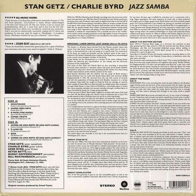 Фірмова вінілова платівка (VINYL)Jazz Samba is a bossa nova album by Stan Getz and Charlie Byrd released by Verve Records in 1962. Jazz Samba signaled the beginning of the bossa nova craze in America. Stan Getz was the featured soloist and the tracks were arranged by Charlie Byrd, who had first heard bossa nova during a tour of Brazil in 1961.
