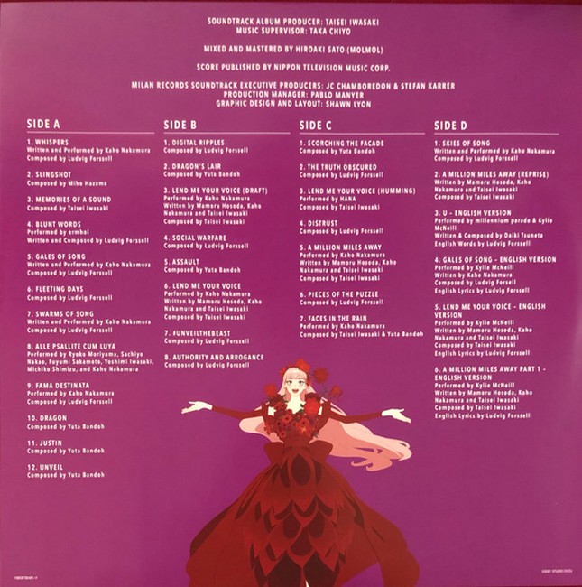 D5 | Lend Me Your Voice- English Version Performer – Kylie McNeill Translated By – Ludvig Forssell Written-By – Mamoru Hosoda, Kaho Nakamura* Written-By, Composed By – Taisei Iwasaki | |