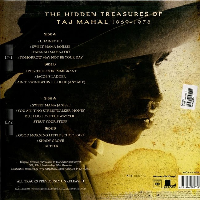 Фірмова вінілова платівка (VINYL)Hidden Treasures of Taj Mahal is a compilation album by American blues artist Taj Mahal. The first disc contains previously unreleased studio tracks recorded between 1969 and 1973. The second disc contains full live concert from April 18, 1970, at Royal Albert Hall in London, England.