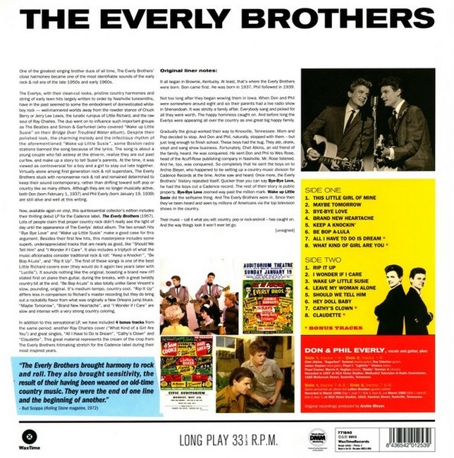 Фірмова вінілова платівка (VINYL)The Everly Brothers is the 1958 eponymous debut album of close harmony singing duo the Everly Brothers. The album peaked at No. 16 on Billboard's pop albums chart and launched three very successful singles. Originally on the Cadence label, (CLP-3003), the album was re-released on LP in 1988 by EMI and on CD in 2000 by Emporio Records. It was re-released again in 2009 on 180-gram vinyl by Doxy music.