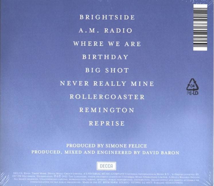 Фірмовий диск (CD)Brightside is the fourth studio album by American indie folk band the Lumineers, released on January 14, 2022, through Dualtone and Decca Records. It was primarily produced by Simone Felice and David Baron. The album was preceded by the release of three singles: the title track, "Big Shot", and "A.M. Radio".
