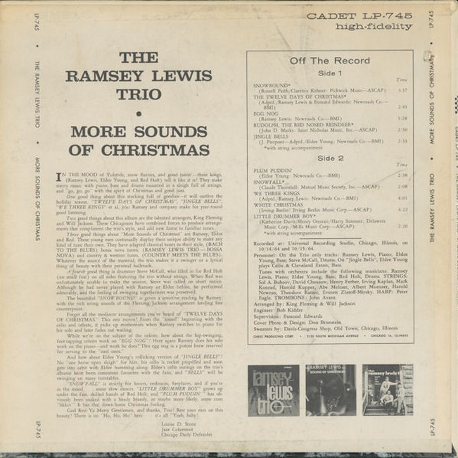 "More Sounds of Christmas" by The Ramsey Lewis Trio, released in 1964, is a jazzy holiday album that brings sophisticated charm to the season. Featuring Ramsey Lewis’ signature piano stylings, the trio delivers elegant renditions of classics like "The Little Drummer Boy" and "Winter Wonderland." The album blends smooth jazz with festive warmth, creating a cozy and refined atmosphere. With its impeccable musicianship and creative arrangements, this record is a timeless addition to Christmas music collections. Perfect for holiday gatherings, it offers a relaxing yet lively soundtrack to celebrate the season.A1 Snowbound 3:37
