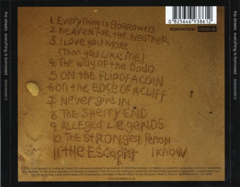 Фірмовий CD-дискEverything Is Borrowed is the fourth studio album by English rapper and producer Mike Skinner, under the music project The Streets. Released in the United Kingdom on 15 September 2008, and in the United States on 7 October 2008, Skinner describes the album as a "peaceful coming to terms album" and as containing "peaceful positive vibes" which stand in stark contrast to the previous album, The Hardest Way to Make an Easy Living, which Skinner has described as a "guilt-ridden indulgence".