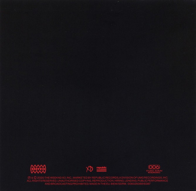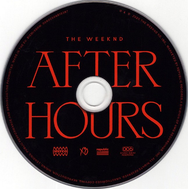 Фірмовий CD-дискAfter Hours is the fourth studio album by Canadian singer the Weeknd, released on March 20, 2020, by XO and Republic Records. Primarily produced by the Weeknd, it features a variety of producers, including DaHeala, Illangelo, Max Martin, Metro Boomin, and OPN, most of whom the Weeknd had worked with previously. The standard edition of the album has no features, but the deluxe edition features Ariana Grande and the remixes edition contains guest appearances from Chromatics and Lil Uzi Vert. Thematically, After Hours explores loneliness, self-loathing, and escapism.
