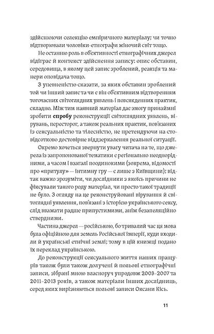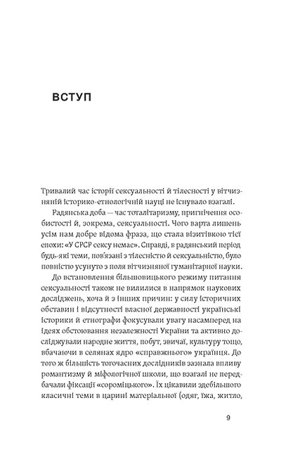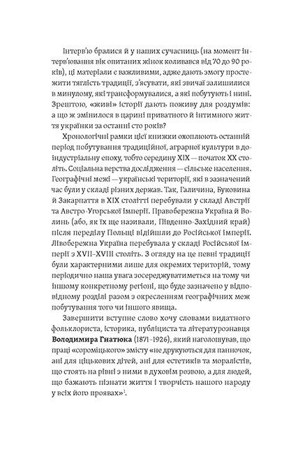 У своїй новій книжці етнологиня Ірина Ігнатенко розповідає історію інтимних стосунків в українських традиціях. Яких чоловіків і жінок українці вважали красивими та бажаними, як знайомилися й до яких засобів «зваблення» вдавалися? У що одягалися наші прапрабабусі та як календар релігійних свят впливав на розклад гігієнічних процедур і секс? Які обмеження на інтимні стосунки були навіть у шлюбі? Чому замовчували зради та як по розбитих горщиках визначали майбутню кількість дітей? Від перших обіймів до першої шлюбної ночі, вагітності, пологів, хвороб і позашлюбних стосунків. Авторка описує тодішнє ставлення до власного тіла й тілесності, особливості весільних обрядів і контрацепції, пологи та заборони.