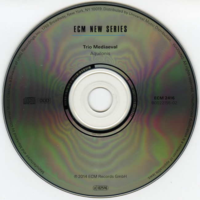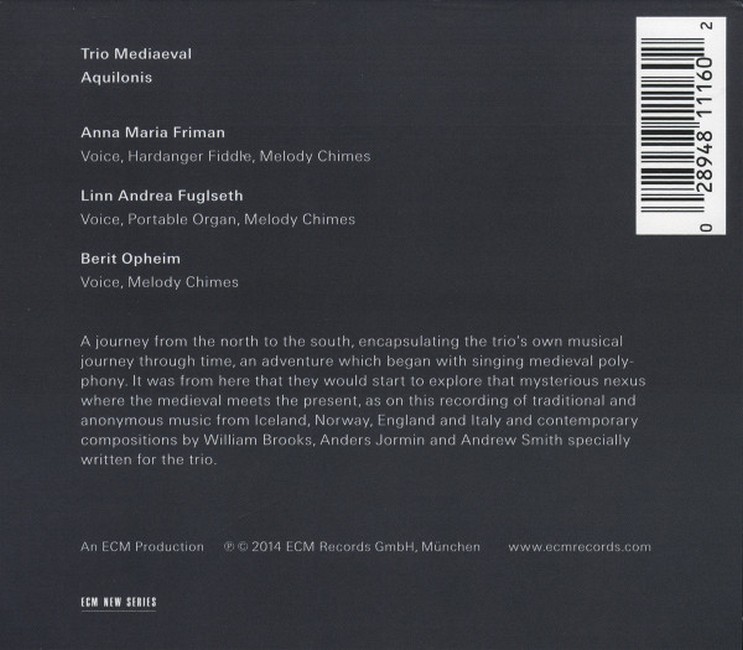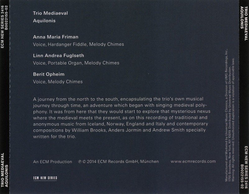Фірмовий CD-дискAquilonis (Latin "of the North Wind") is a classical and choral studio album by the Swedish trio Trio Mediaeval recorded in June 2014 and released on the ECM New Series November that same year.