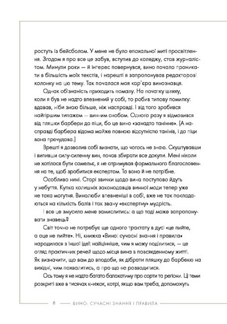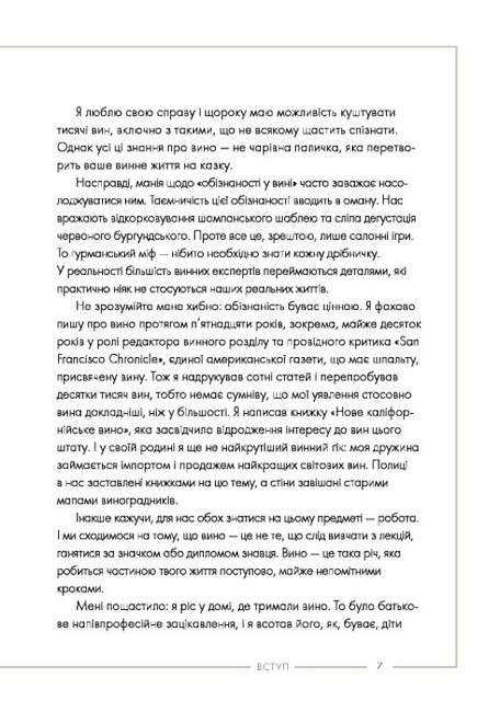 Не так уже й багато в житті задоволень, кращих за келих чудового вина. Але для декого радість від напою затьмарюється муками вибору і численними правилами та забобонами від так званих експертів. Ця книжка допоможе вам відкинути складнощі й навчитися головного — як без перешкод насолоджуватися прекрасним винаходом людства. Не зациклюватися на вартості, бо вона не завжди гарантує якість; не боятися ставити питання консультантам у магазині й сомельє в ресторані; не піддаватися впливу моди та брендів, а обирати саме те, що до вподоби вам. Перегорнувши останню сторінку, ви зможете як профі відкоркувати пляшку найкращого саме для вас вина, розлити його у правильний посуд і влаштувати з друзями незабутній вечір у себе вдома або запросити їх до ресторану і здивувати своїми знаннями винолюба.