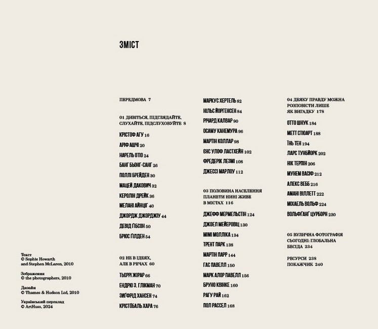 Наблизьтеся до світу вуличної фотографії. Ця книга зібрала 43 сучасних митців, які не втомлюються документувати повсякденність під різними кутами. Серед них — видатні майстри, члени Magnum, як-от: Брюс Ґілден, Мартін Парр, Алекс Вебб, а також інші фотографи з різних країн, кожен з яких презентує унікальне бачення світу.