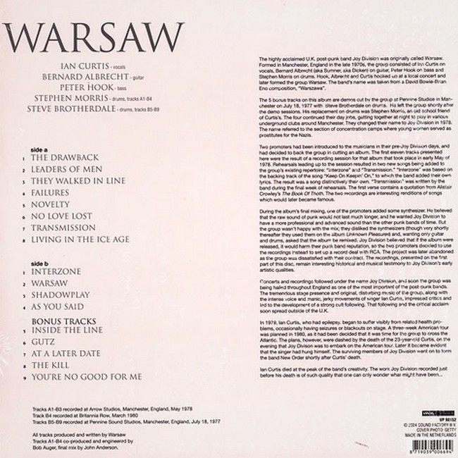 Фірмова вінілова платівка (VINYL)Warsaw was the planned debut album by the English post-punk band Joy Division, while they were briefly associated with RCA Records. Recorded in May 1978, it comprised eleven tracks now known collectively as the "RCA Sessions". However, the band were disappointed with the label's post-production work and the deal fell through, the album being scrapped.