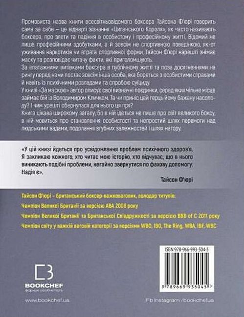 Промовиста назва книги всесвітньовідомого боксера Тайсона Ф’юрі говорить сама за себе — це відверті зізнання «Циганського Короля», як часто називають боксера, про злети та падіння в особистому і професійному житті. Відомий не лише професійними здобутками, а й зовсім не спортивною поведінкою, як-от уживання наркотиків чи втрата спортивної форми, Тайсон Ф’юрі нарешті знімає маску та розповідає читачу факти, які приголомшують. За епатажними витівками боксера в публічному житті та поза досягненнями на рингу перед нами постає зовсім інша особа, яка бореться з особистими страхами й навіть із психічними розладами та спробою суїциду. У книзі «За маскою» автор описує свої визначні поєдинки, серед яких чільне місце займає бій із Володимиром Кличком. Та чи приніс цей герць йому бажану насолоду? І чим врешті обернулася для нього ця пря?
